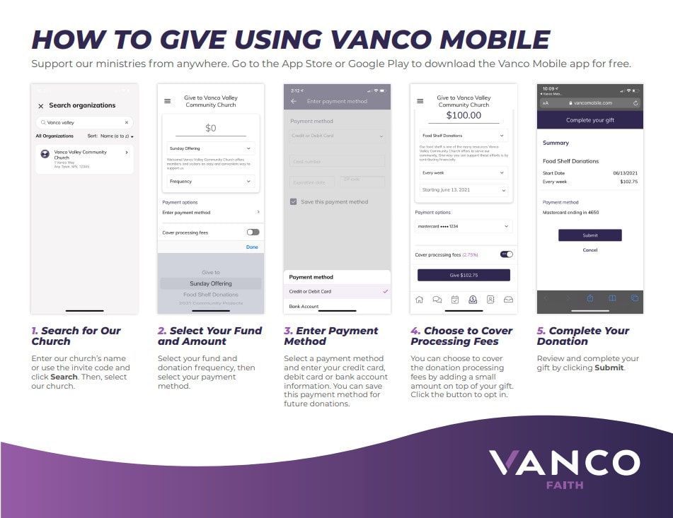 Download the Vanco Faith App and set up a one-time gift or recurring giving. Click for details!